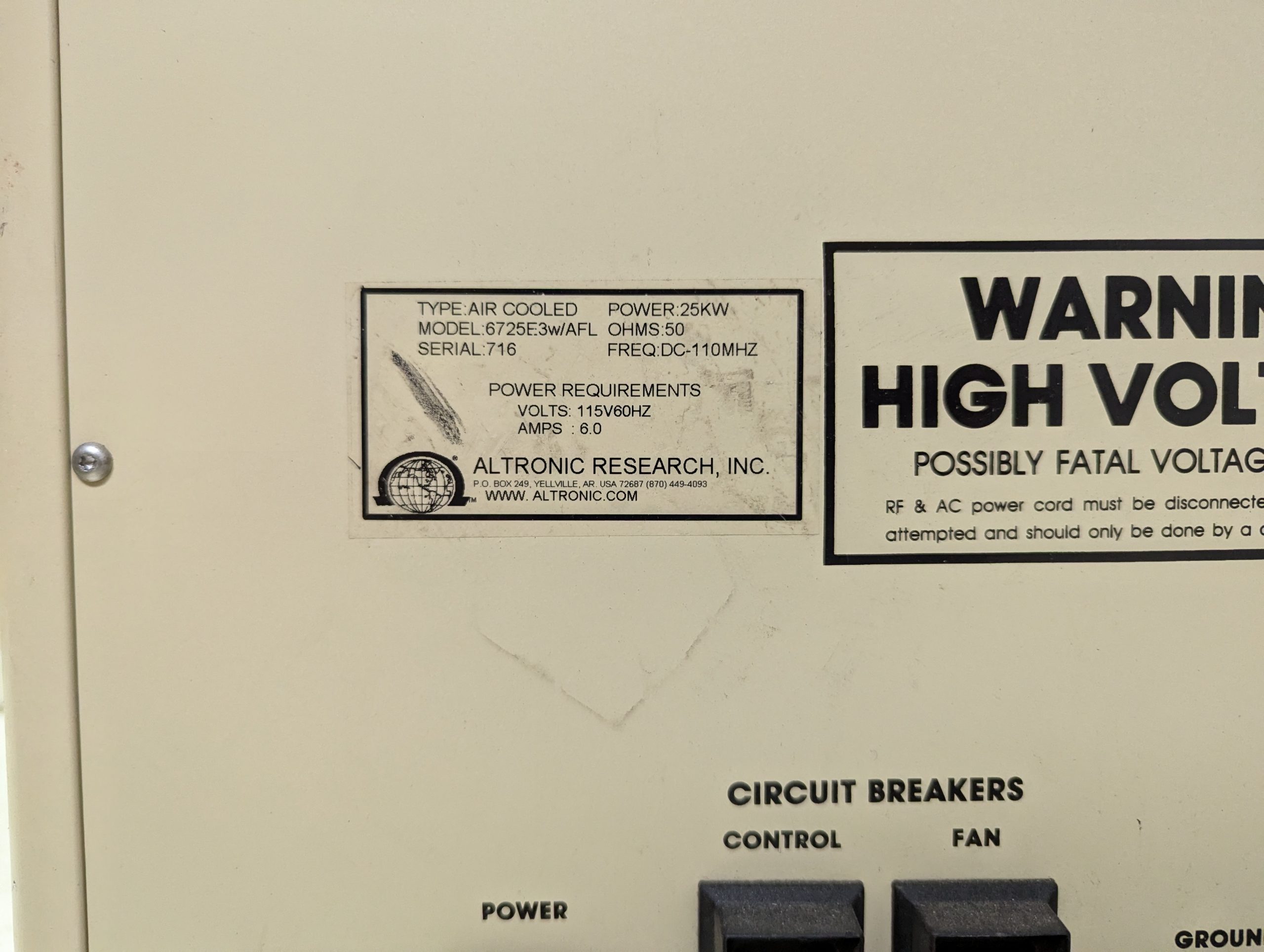 Used Altronic RF test load, 25 KW air cooled. Cleaned, motor checked, load measured with a Network Analyzer and is within manufacturer’s specifications.